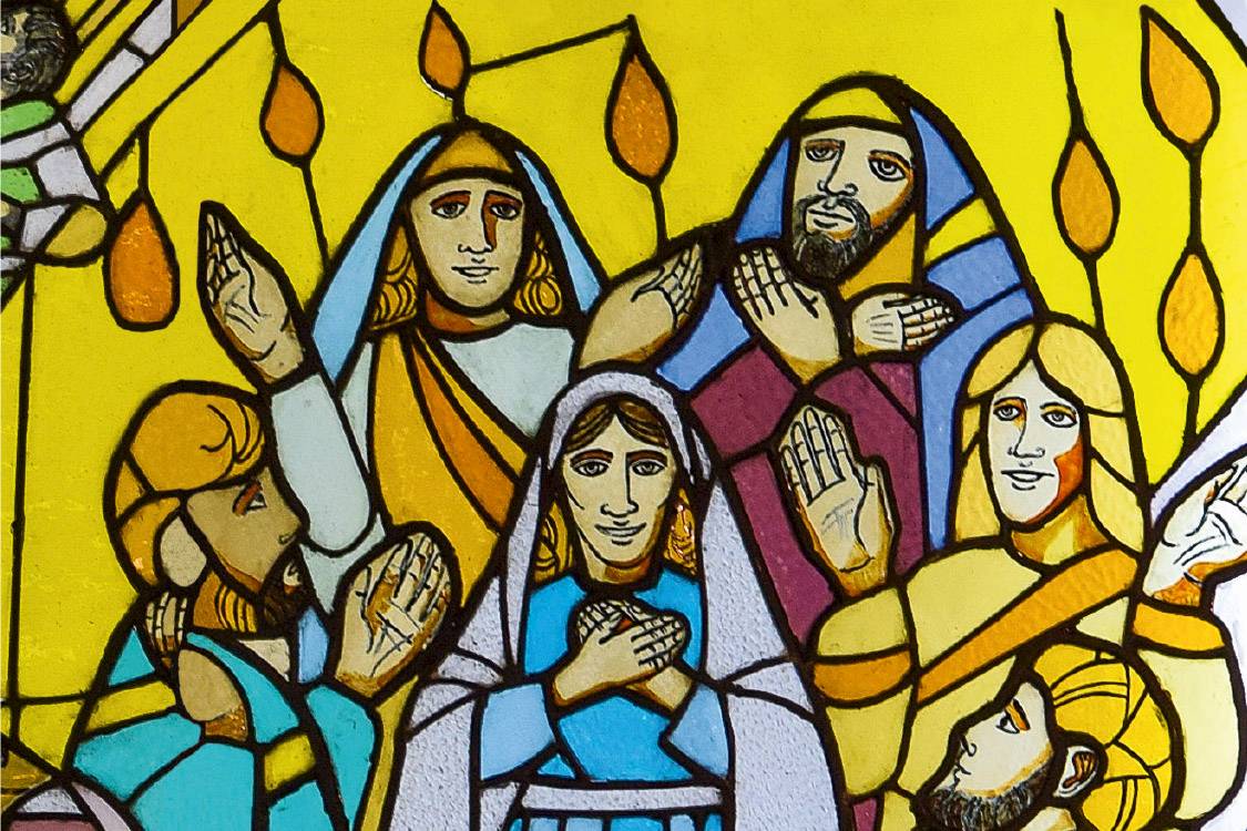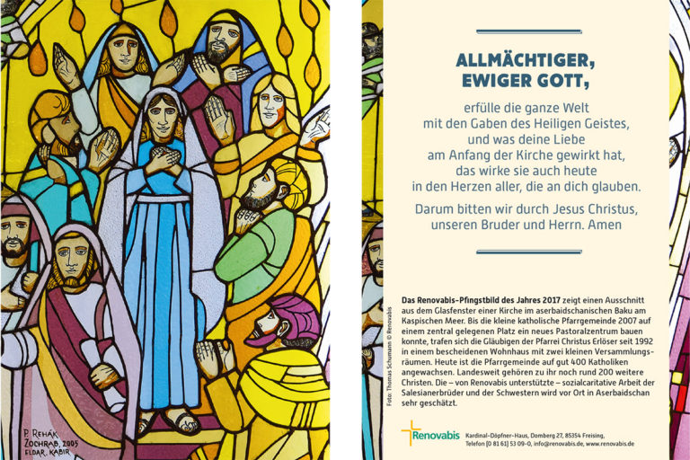 Das Renovabis-Pfingstbild des Jahres 2017 zeigt einen Ausschnitt aus dem Glasfenster einer Kirche im aserbaidschanischen Baku am Kaspischen Meer. Bis die kleine katholische Pfarrgemeinde 2007 auf einem zentral gelegenen Platz ein neues Pastoralzentrum bauen konnte, trafen sich die Gläubigen der Pfarrei Christus Erlöser seit 1992 in einem bescheidenen Wohnhaus mit zwei kleinen Versammlungsräumen. Heute ist die Pfarrgemeinde auf gut 400 Katholiken angewachsen. Landesweit gehören zu ihr noch rund 200 weitere Christen. Die – von Renovabis unterstützte – sozialcaritative Arbeit der Salesianerbrüder und der Schwestern wird vor Ort in Aserbaidschan sehr geschätzt.